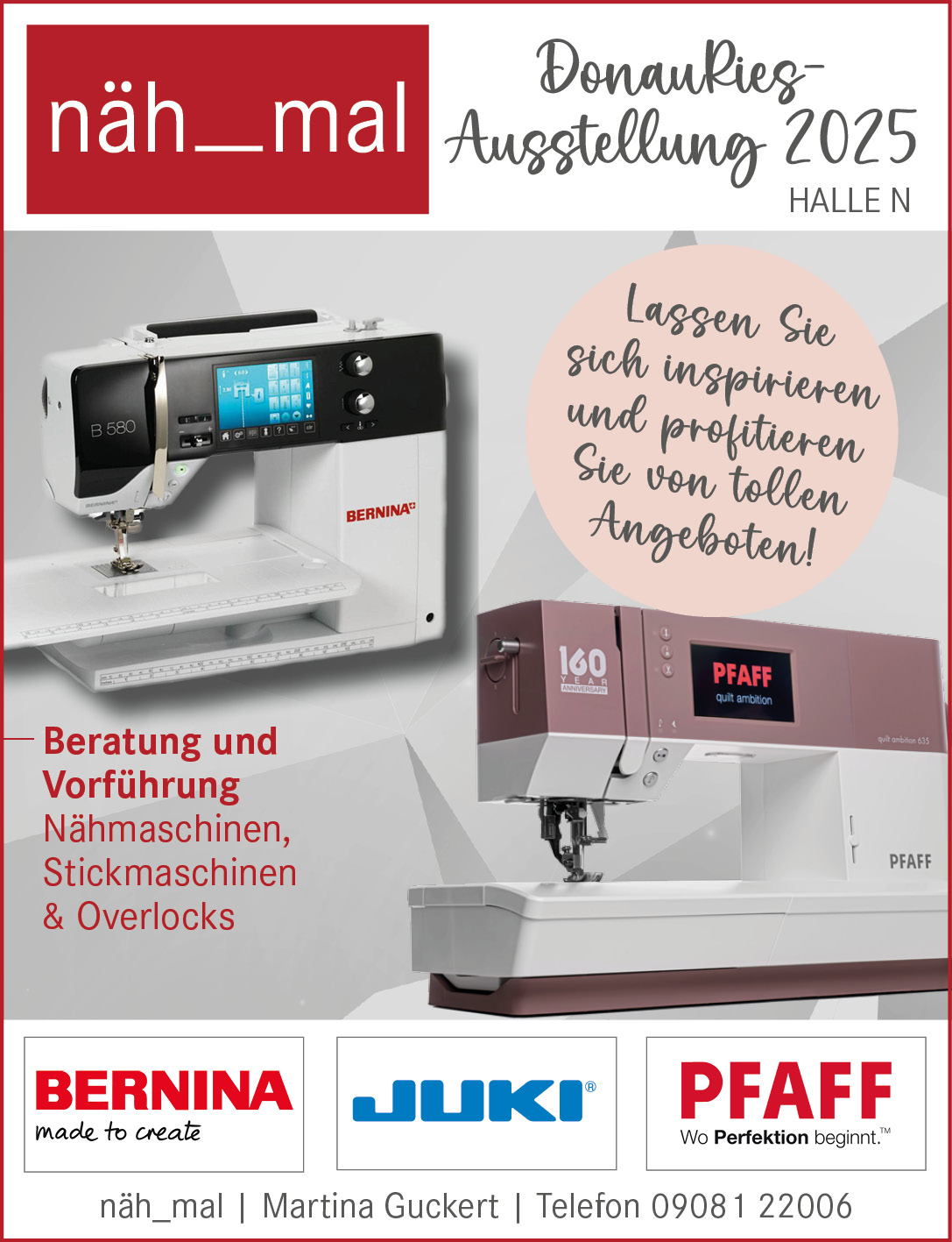 näh_mal – der Stoffladen in Nördlingen (Inhaberin Martina Guckert) ist in Halle N vertreten. Das charmante Stoffgeschäft bietet eine große Auswahl an Stoffen und Kurzwaren, kompetente Beratung rund um Nähmaschinen sowie attraktive Nähkurse – unter anderem auch zu historischen Gewändern. Alles unter einem Dach, regional verankert und mit Leidenschaft für’s Nähen.